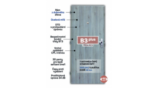 Bezpečnostní protipožární dveře B3 Plus s ocelovou zárubní jsou vylepšenou verzí dveří třídy B3. Mají zesílenou tloušťku 46 mm, 7 aktivních čepů a ocelovou mříž uvnitř konstrukce. Nabízí vyšší bezpečnost, protihlukovou úpravu 34 dB a 3bodový bezpečnostní systém.