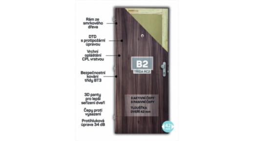 Bezpečnostní protipožární dveře B2 s ocelovou zárubní poskytují maximální ochranu proti vloupání i požáru. Nabízí 3bodový bezpečnostní systém, zesílenou konstrukci a protihlukovou úpravu 34 dB.