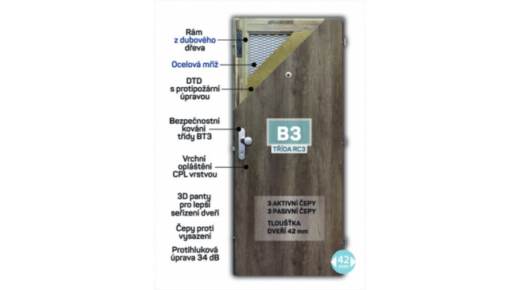Bezpečnostní protipožární dveře B3 s ocelovou zárubní jsou certifikované na třídu bezpečnosti B3 a obsahují masivní ocelovou mříž uvnitř konstrukce. Nabízí 3bodový bezpečnostní systém, zesílený rám z dubového dřeva a protihlukovou úpravu 34 dB.
