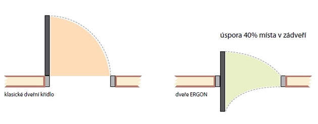 Systém minimalizuje nároky na půdorysný prostor. Díky otočně-posuvným dveřím ušetříte až 40 % místa. Umožňují otevírání na obě strany.
